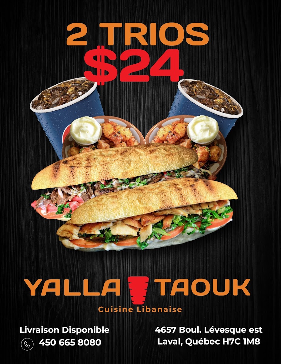 At Yalla Taouk, the menu boasts a delightful array of dishes that pay homage to the rich culinary traditions of the region. One highlight is the Yalla Baguette Trios, featuring succulent Baguette Brochette De Poulet, where tender chicken skewers are lovingly grilled to perfection and served on a crispy baguette, nestled alongside crisp lettuce, fresh tomatoes, vibrant cabbage, and onions. Each bite, drizzled with your choice of delectable baguette sauce, transports your taste buds straight to the sunny streets of the Middle East, all for just CA$19.98.